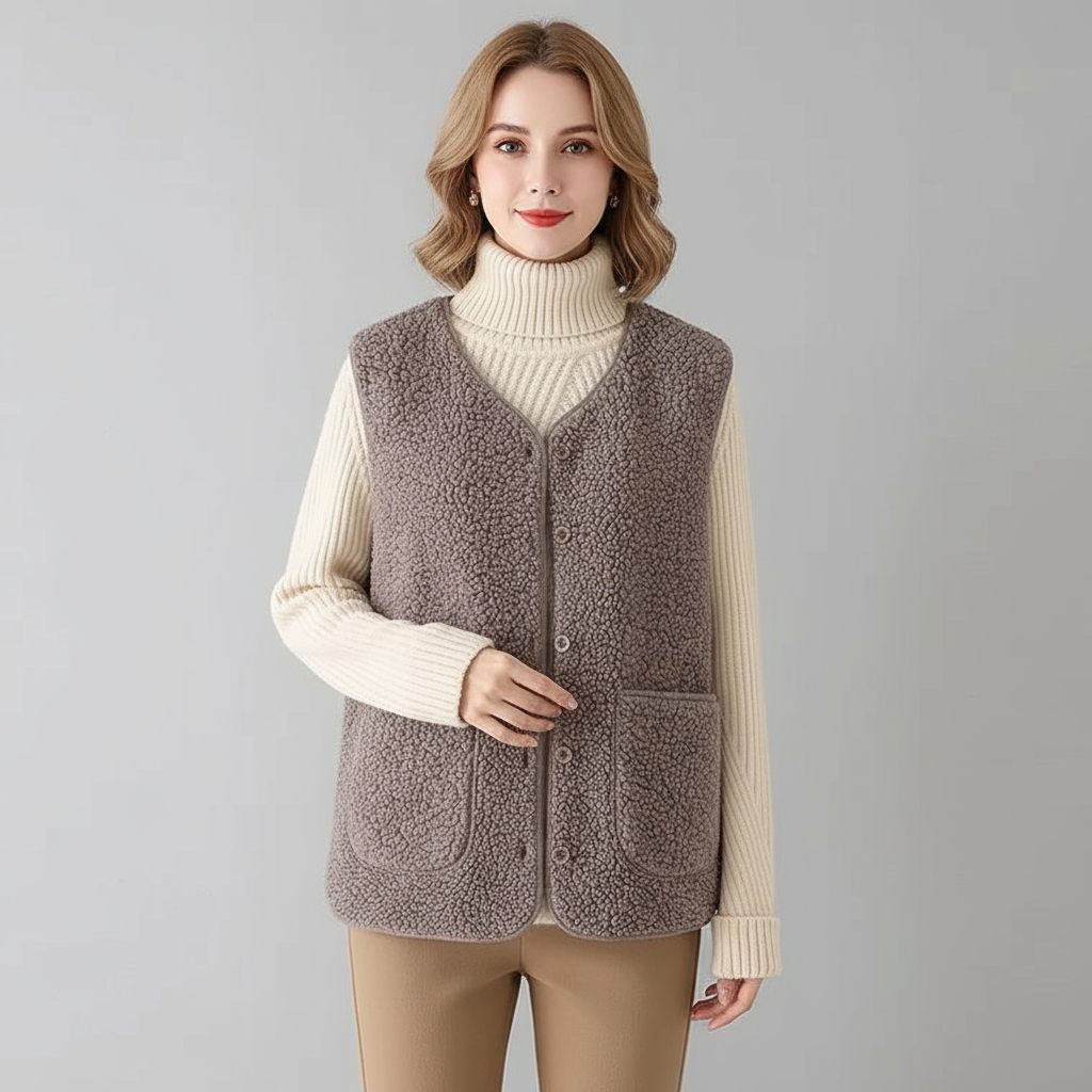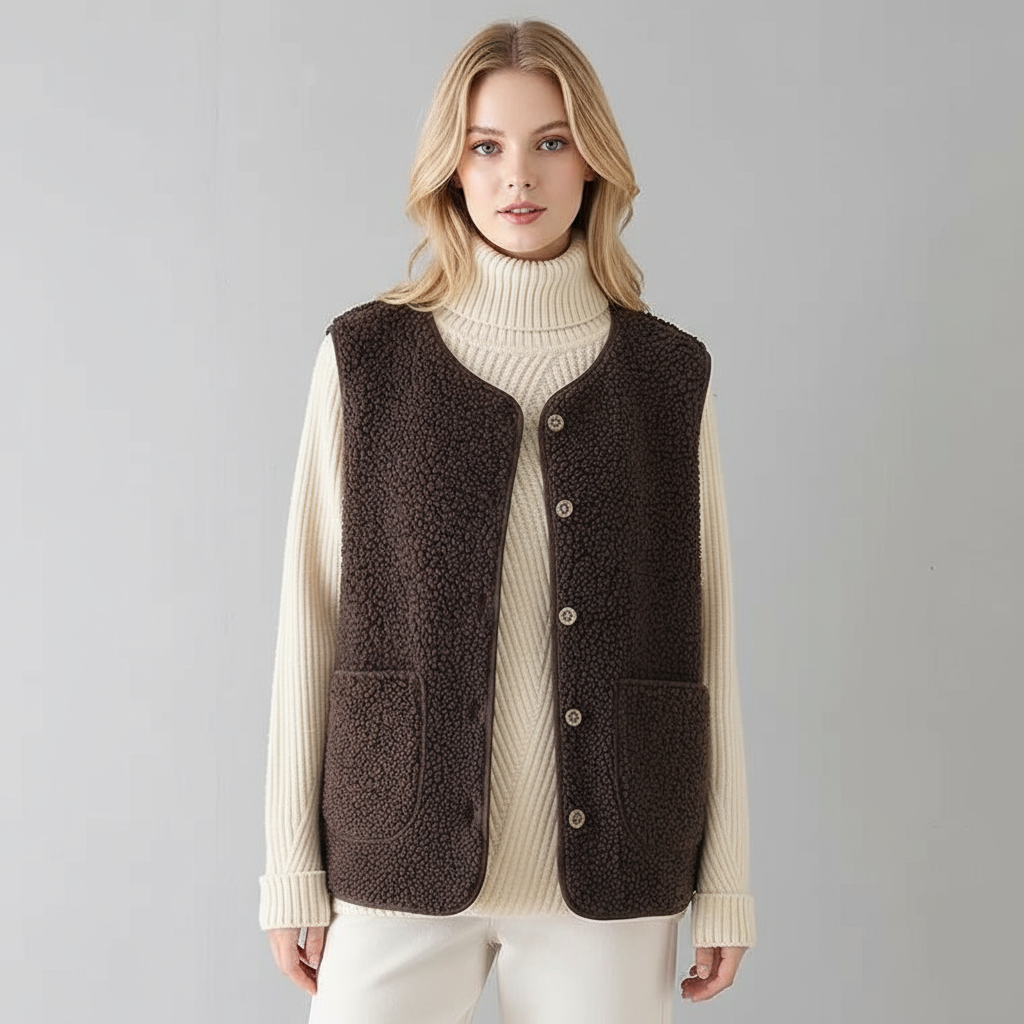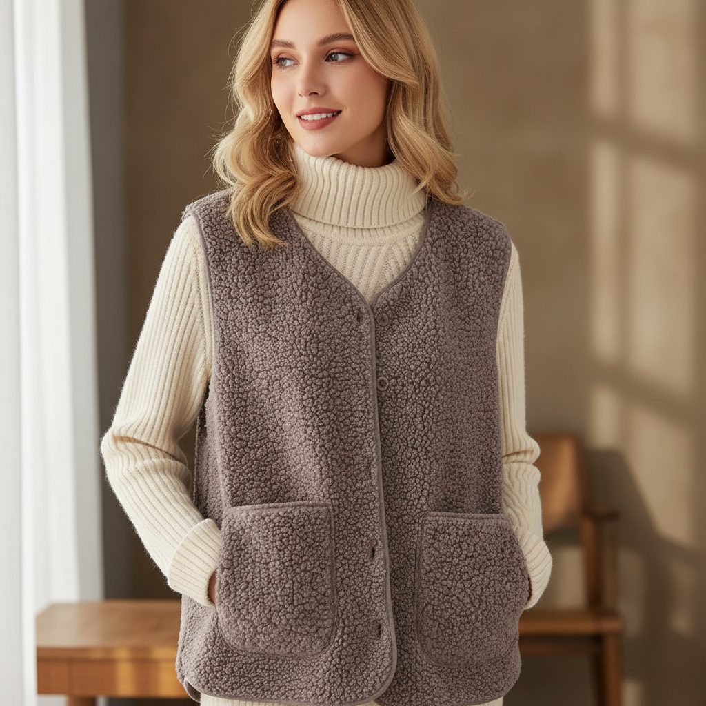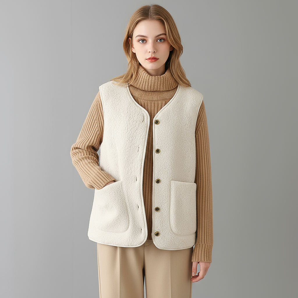 Meet the Sherpa Cardigan Gilet that redefines everyday luxury. Crafted from a breathable wool blend with a soft, non-itchy finish, she wraps you in gentle warmth without the weight. Whether you're layering over a silk cami or pairing with your favorite denim, this piece brings an understated elegance to every moment. This is the layer you'll reach for again and again—timeless, versatile, and impossibly cozy.